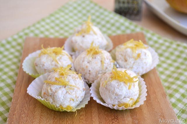 - Poggiate le palline di ricotta mandorle e limone su un piatto da portata, decorate con un pezzettino di buccia di limone e servite.