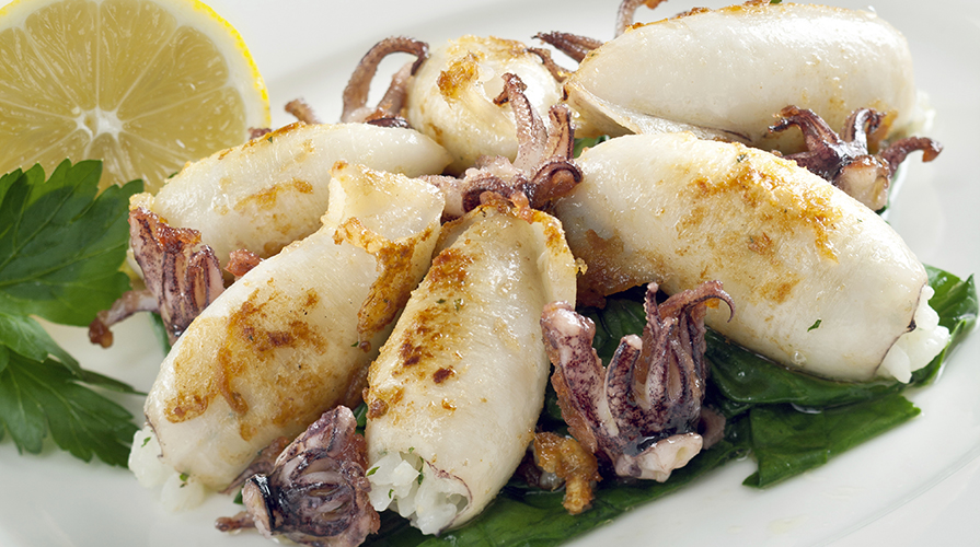 Ricetta – Calamari ripieni alla piastra con scarola stufata e scamorza affumicata