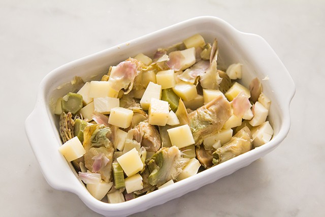 Tagliate a fette sottili la scamorza affumicata e distribuitene uno strato sopra il pollo. Trasferite li restanti carciofi e distribuiteli uniformemente con una spatola.