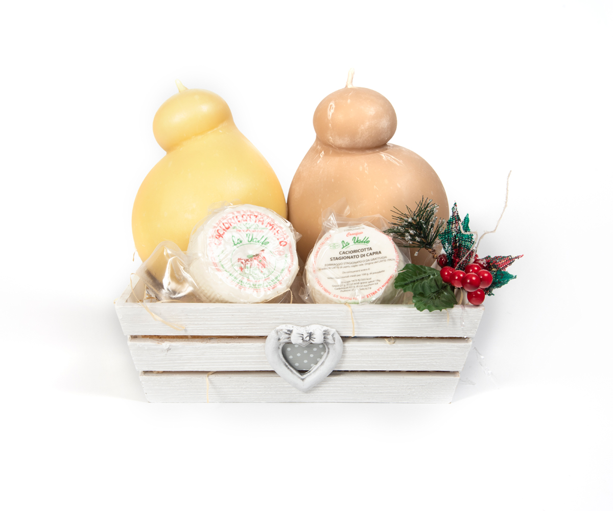 Una doppia coppia di formaggi pugliesi, caciocavalli e di cacioricotta per questo cestino, che vi cosentina di fare varie combinazioni tra i gusti di formaggi per regalare ai vostri affetti un mix di sapori unico e personalizzato.