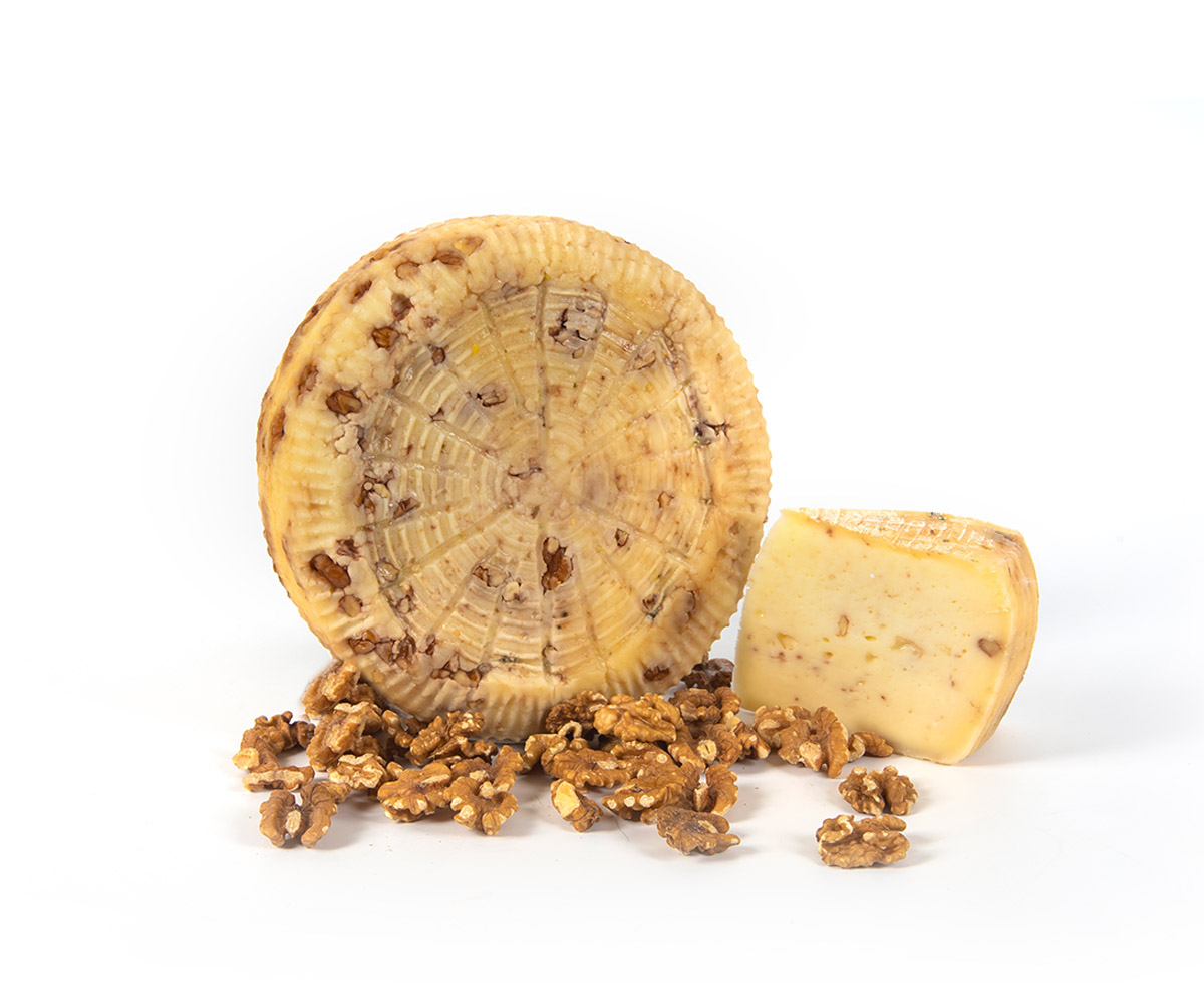 I gherigli di noci vengono frantumati per poi essere aggiunti e mescolati nella pasta della caciotta alle noci prima della fase di formatura nelle fuscelle.